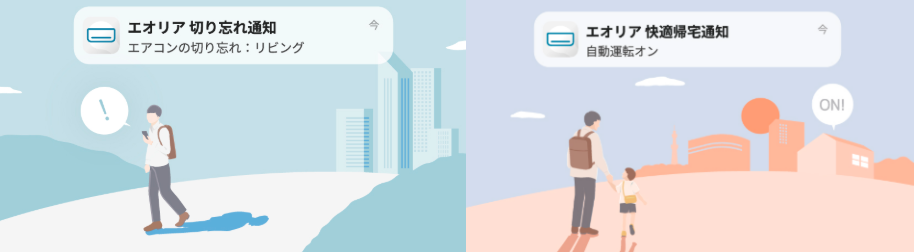 スマートフォンの位置情報を利用し、自宅に近づくと自動で運転を開始したり、エアコンを切り忘れたまま外出してしまったときにアプリでお知らせをしてくれる便利な機能です。