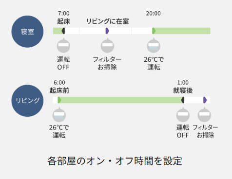 また、各部屋ごとに運転のON・OFF時間を設定できるので、寝る前の寝室や、朝起きる前のリビングも簡単に快適にできちゃいます。