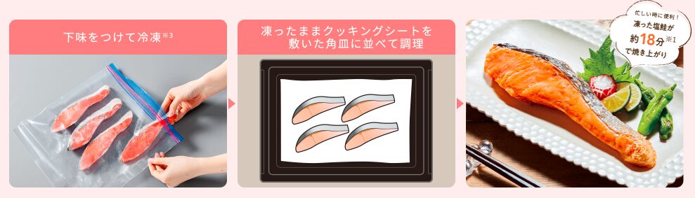 週末に下味をつけて冷凍しておいた食材をそのまま焼くだけで、忙しい日でもあっという間に本格的な料理ができちゃいます。