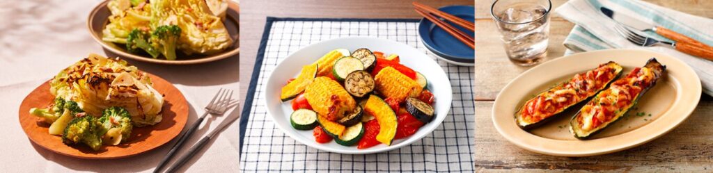 レンジ加熱で食材の中の温度を上げ、加熱水蒸気とオーブンの熱風で食材の旨味を閉じ込めてから、最後にグリルで一気に過熱することで、時短料理なのに、野菜本来の甘みと栄養を引き出した料理が簡単に出来ちゃいます。