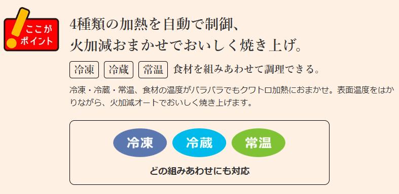 - クワトロ加熱機能(新型モデルは、温度が異なる食材も同時に加熱可能)