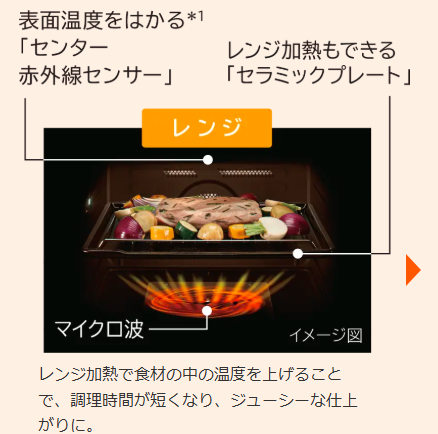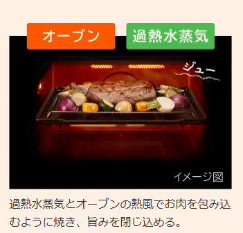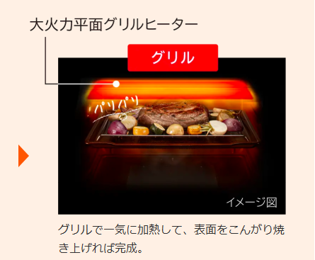 「クワトロ加熱機能」は、レンジ・オーブン・過熱水蒸気・グリルの4つの熱源を組み合わせて、食材を最適な火加減でおいしく焼き上げてくれる便利な機能です。
