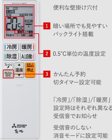 また「消音モード」機能を設定していない場合も、運転モード別に受信音が分かれており、液晶画面を見なくても、音で設定モードが分かる工夫がされています。