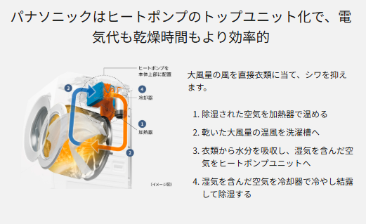 パナソニックが誇る、世界で初めて採用された「ヒートポンプ」のトップユニット化で、消費電力量が約1.5%削減。