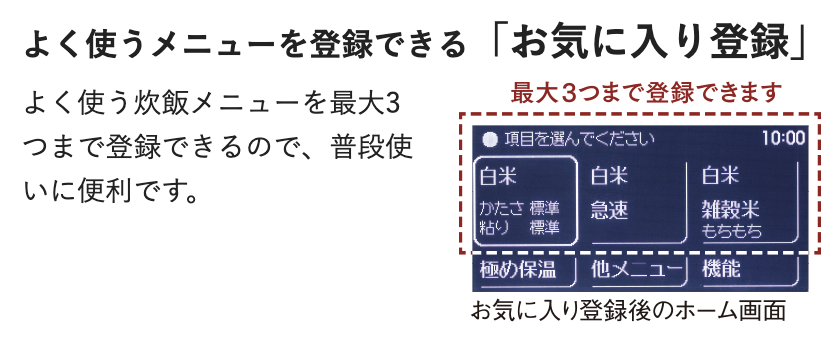 お米の硬さ・粘り・炊飯スピードなど、好みに合わせた調整ができ、最大3つまでホーム画面に登録可能です。