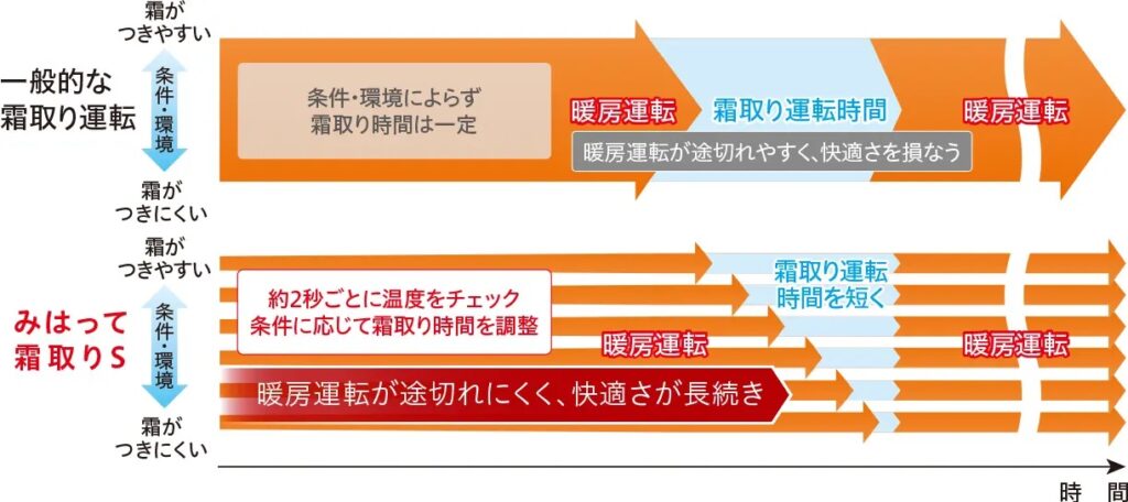 室外熱交換器の温度と外気温をきめ細かくチェックし、必要な時だけ除霜運転を行うことで、暖房時の快適さを長続きさせます。