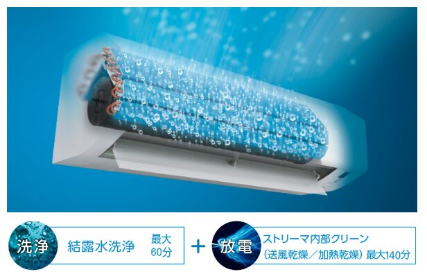 また、洗浄後はダイキン独自のストリーマー照射と乾燥運転を行い、熱交換器や吹き出し口の内部に残ったカビや臭いの原因菌もしっかり抑制します。