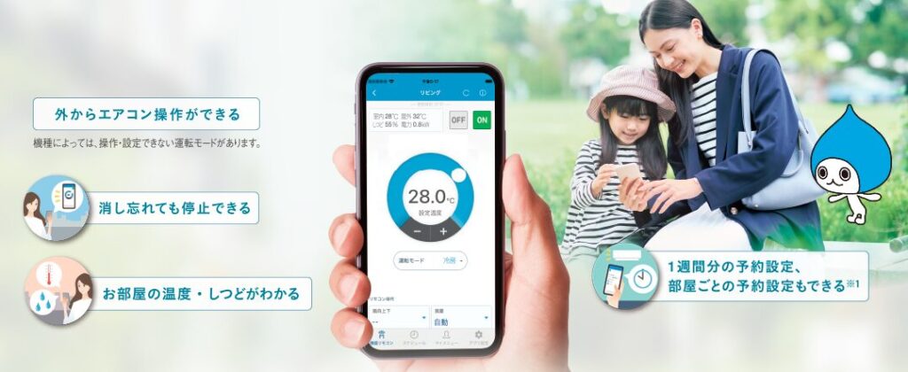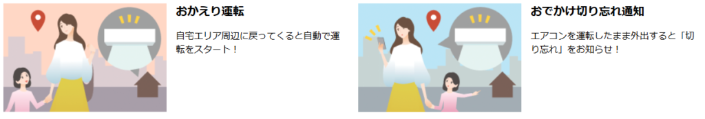 スマートフォンの位置情報を利用し、自宅に近づくと自動で運転を開始したり、自宅から一定距離以上離れた際に、エアコンが運転中だとお知らせをしてくれる便利な機能です。