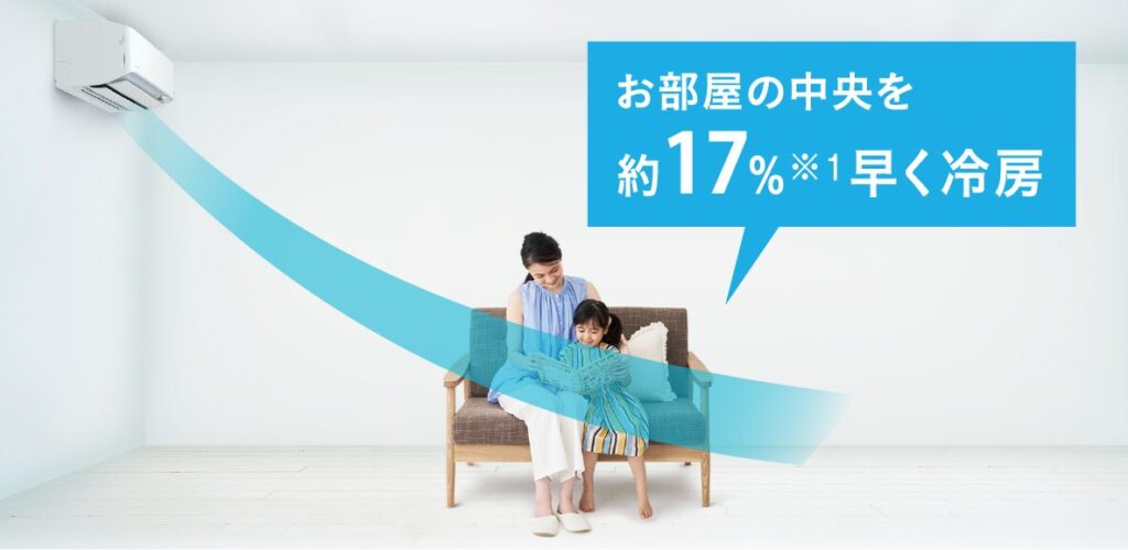 新型モデルは、起動時に外気温35℃以上の時運転を開始すると、お部屋の中央へより涼しく冷房気流を集中させすばやく立ち上げます!