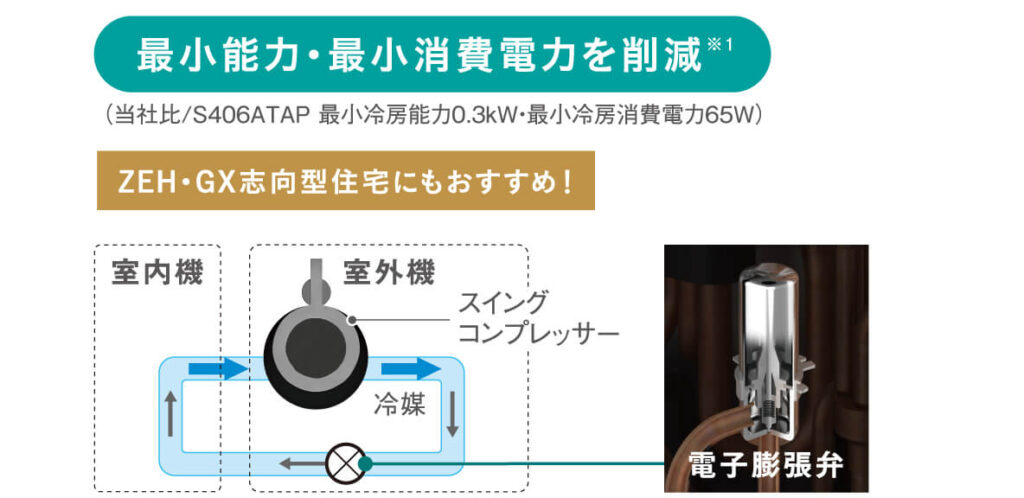 室外機に搭載した「スイングコンプレッサー」「電子膨張弁」の働きにより、小さな能力でも安定した運転ができ、室温を一定に保てます。