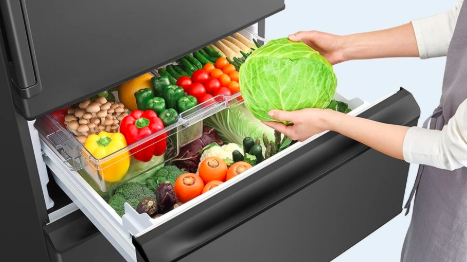 野菜室は密閉性を高める構造が施されており、野菜から出る水分を閉じ込め乾燥を防いでくれるので、レタスや小松菜などの葉物野菜も、数日間「シャキッ」とした食感をキープ。
