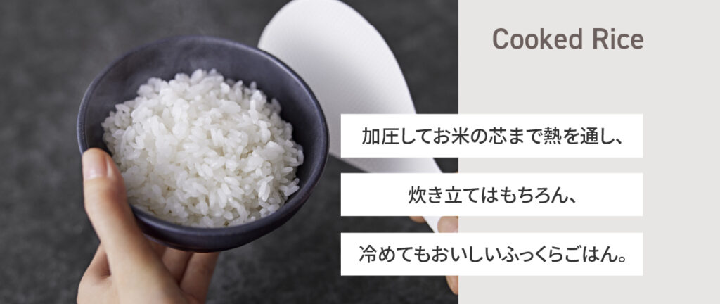 新型は表面はべたつきを抑え、中はやわらかく、ふっくら火通りのよい炊き上がりに炊けるようになりました。
