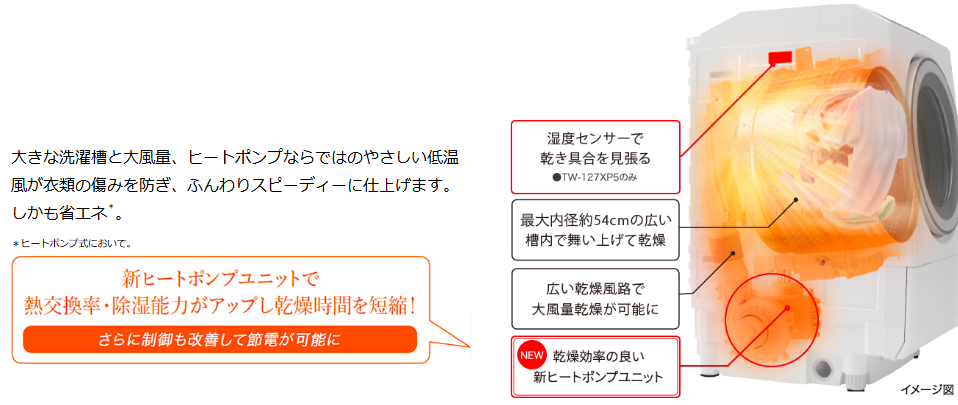 新型モデルTW-127XM5は、ヒートポンプユニットが、乾燥効率の良い新ヒートポンプユニットに進化しました。