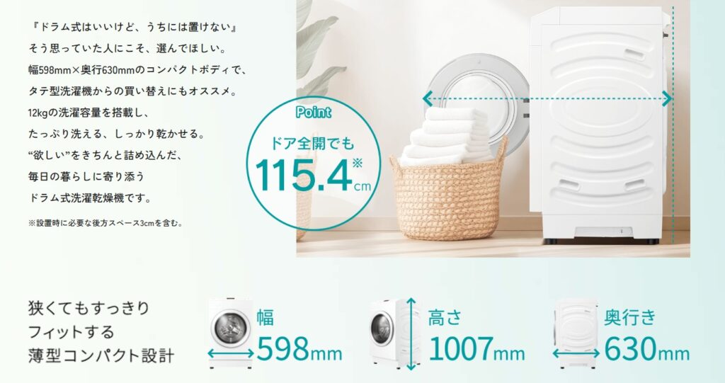 マンションや設置場所が限られる場所でも、Hisenseのドラム式洗濯乾燥機は置きやすいです。