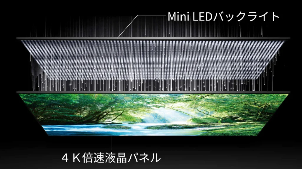 新開発の高輝度Mini LED液晶パネルが搭載され、より明るさや色の表現力が向上し、有機ELテレビに劣らないような、深く引き締まった鮮明な映像が楽しめます。